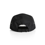 Low profile five panel cap, mesh side panels, adjustable plastic fastener, metal side eyelets, flat peak